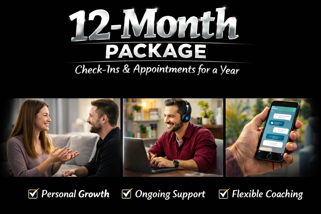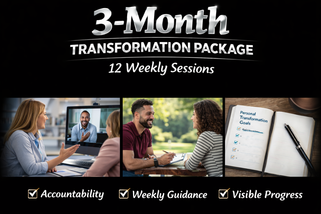 Description: A journey of steady growth! Over 12 weekly one-to-one sessions, we’ll dive deep into your personal goals, breaking down what matters most and building practical steps to achieve them. We’ll keep you accountable, motivated, and on track, adjusting as you progress. Sessions are personalized—face-to-face, by phone, or live chat—ensuring you stay on your chosen path to lasting transformation.